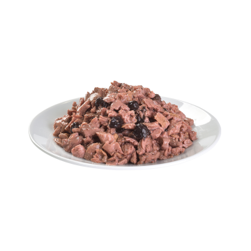 77 % de carne y derivados animales en filetes, 8 % de pescado y derivados de pescado (de este 4 % salmón, 4 % arenque), 2,7 % harina de guisantes, 1,5 % arándanos secos, 0,9 % lignocelulosa, 0,4 % clavo seco, 0,4 % cítricos secos, 0,4 % romero seco, 0,4 % cúrcuma seca, 0,2 % carbonato de calcio.