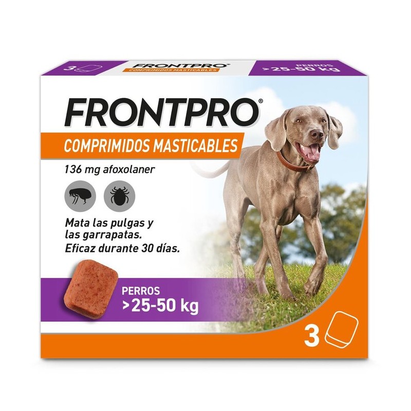 Frontpro presenta estos comprimidos masticables antiparasitarios para perros, los cuales erradican a los parásitos externos con solo un comprimido al mes. Su principio activo es Afoxolaner, el cual es un insecticida y acaricida que provoca una reacción en el sistema nervioso central del perro, para matar a las pulgas, garrapatas y ácaros, incluso desde antes de que pongan huevos.