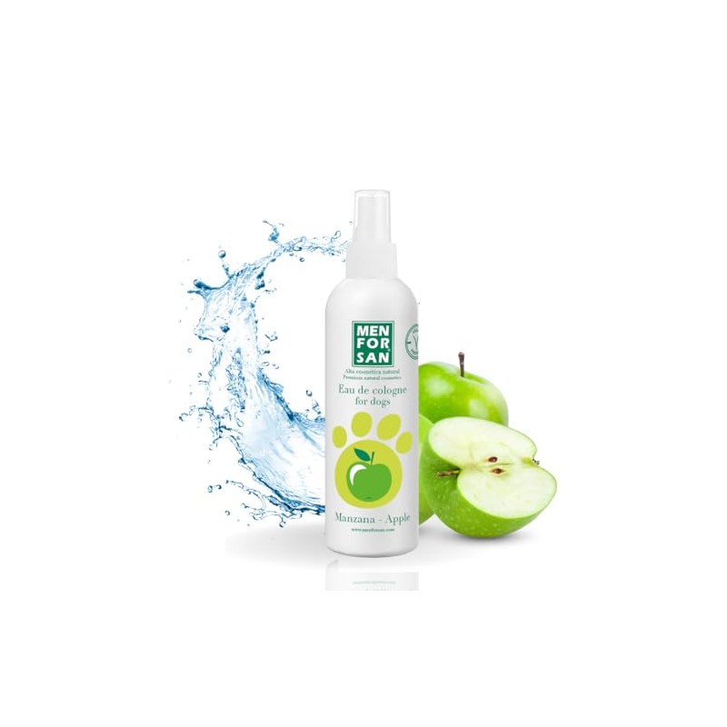 Agua de colonia para perros con fragancia a MANZANA especialmente creada para proporcionar después del baño un olor fresco y un intenso efecto desodorante muy agradable respetando la piel y las propiedades olfativas del animal. No contiene alcohol y tiene pH neutro careciendo de efectos irritantes y evitando que el perro estornude después de su aplicación.